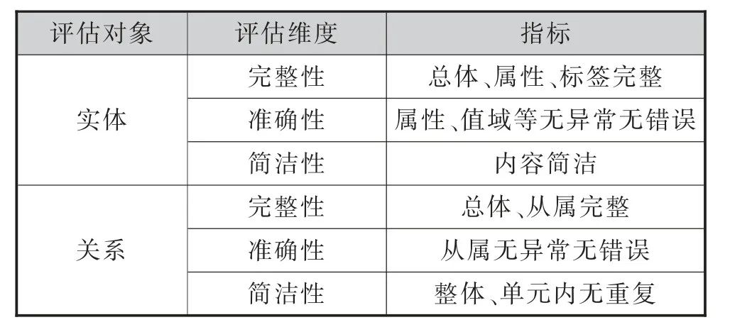 目前,学界对知识图谱的研究集中在知识抽取、存储、融合、推理等方面,从业务需求出发的知识图谱质量评估的研究较少, 现有研究常与传统数据质量维度(语义完整性、语义简洁性、语义准确性)相结合评估知识图谱数据质量(刘洋,等,2021)。为此,本研究通过整理大单元教学的应用需求,结合学科知识图谱知识元实体和实体关系的内容结构, 确定了面向大单元的学科知识图谱质量评估指标, 应用于信息科技学科知识图谱的数据质量评价,如表1 所示。
