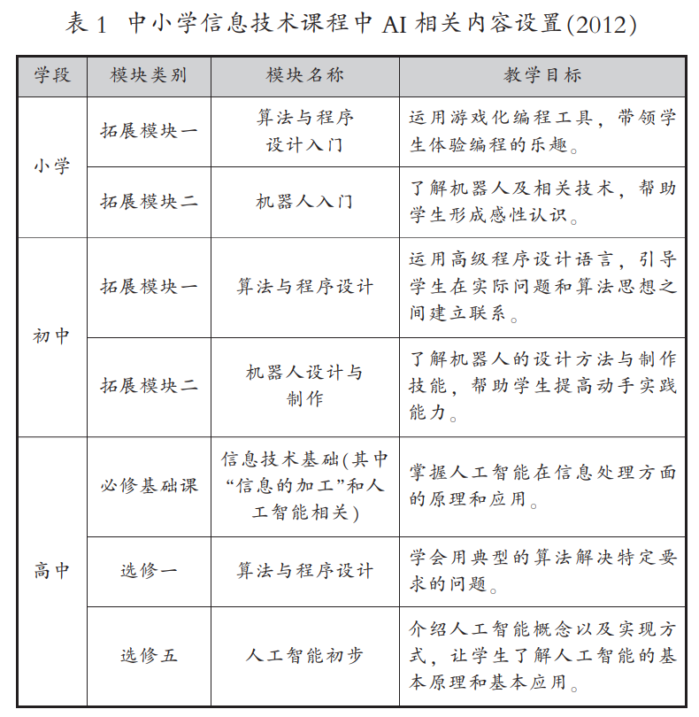 通过对不同时期信息技术课程标准的梳理与比较, 我们能够更为清晰地看出中小学信息技术课程教学目标的发展脉络及 AI 相关内容设置的演变。我国中小学信息技术课程标准一般包括:课程目标、课程内容架构、课程开设建议、课程内容描述、教材编写建议、教学建议、评价建议、教师发展建议八个部分。AI 相关内容是信息技术课程的一部分,多属于选修模块,表 1 所示是 2012 版中小学各级信息技术课程标准对 AI 相关教学内容的安排。