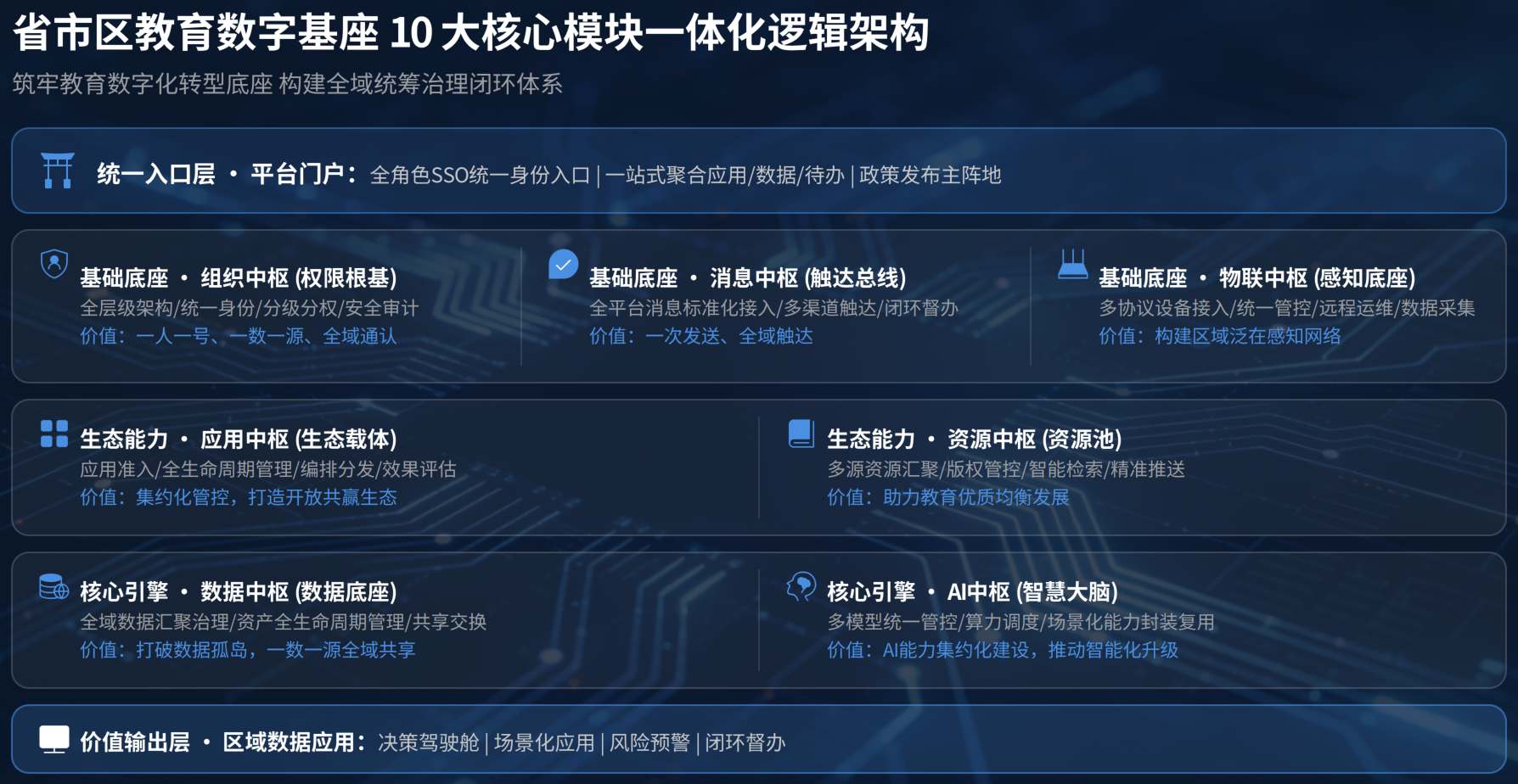 其核心定位,是区域教育数字化的数字底座、治理中枢、能力中台、生态载体,是向上衔接国家、省级智慧教育平台,向下覆盖所有学段、所有学校、所有师生,横向拉通各业务科室、各条线工作的唯一全域性数字化基础设施。